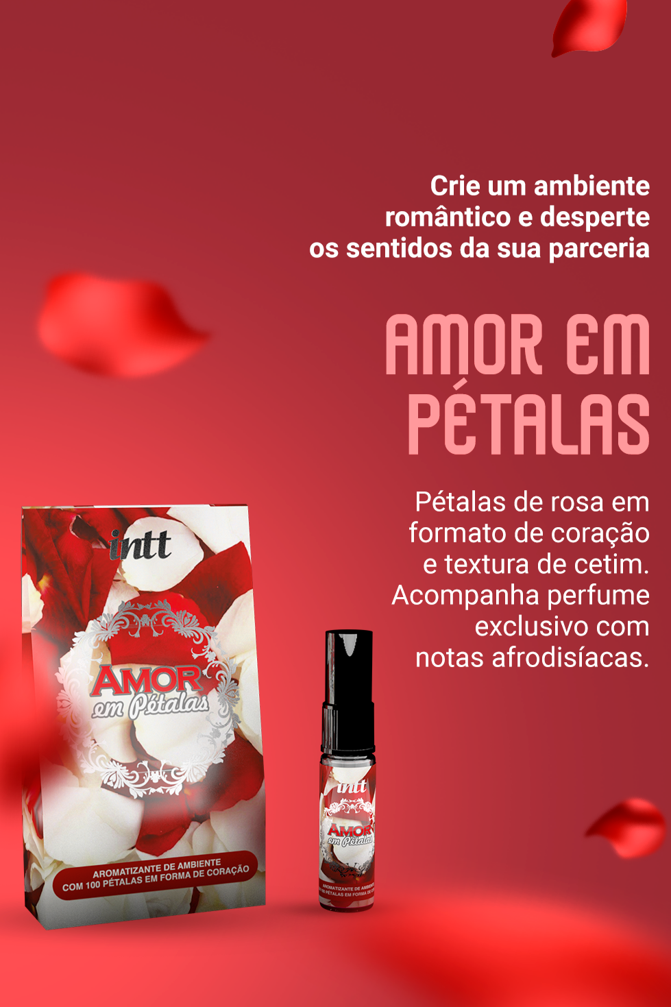 Contém: Perfume com 15ml e 100 pétalas de cetim em formato de coração.