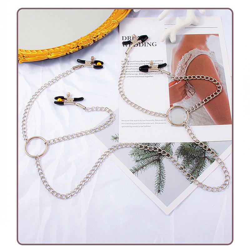 O prendedor de mamilos possui ajustes e guizo de metal.