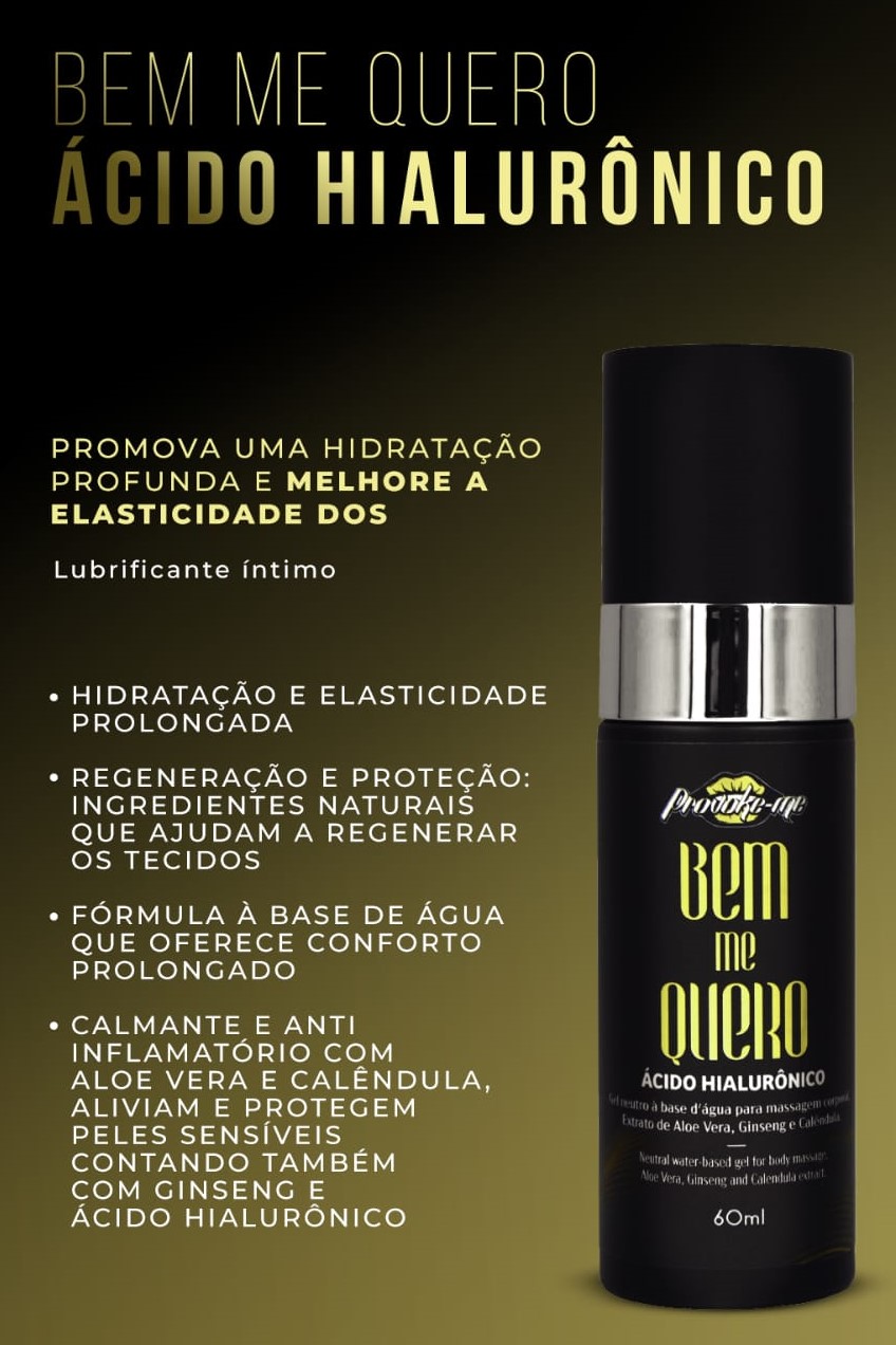 O Bem Me Quero Lubrificante Ácido Hialurônico é um lubrificante íntimo à base de água, formulado com o ácido hialurônico como um de seus principais ingredientes.