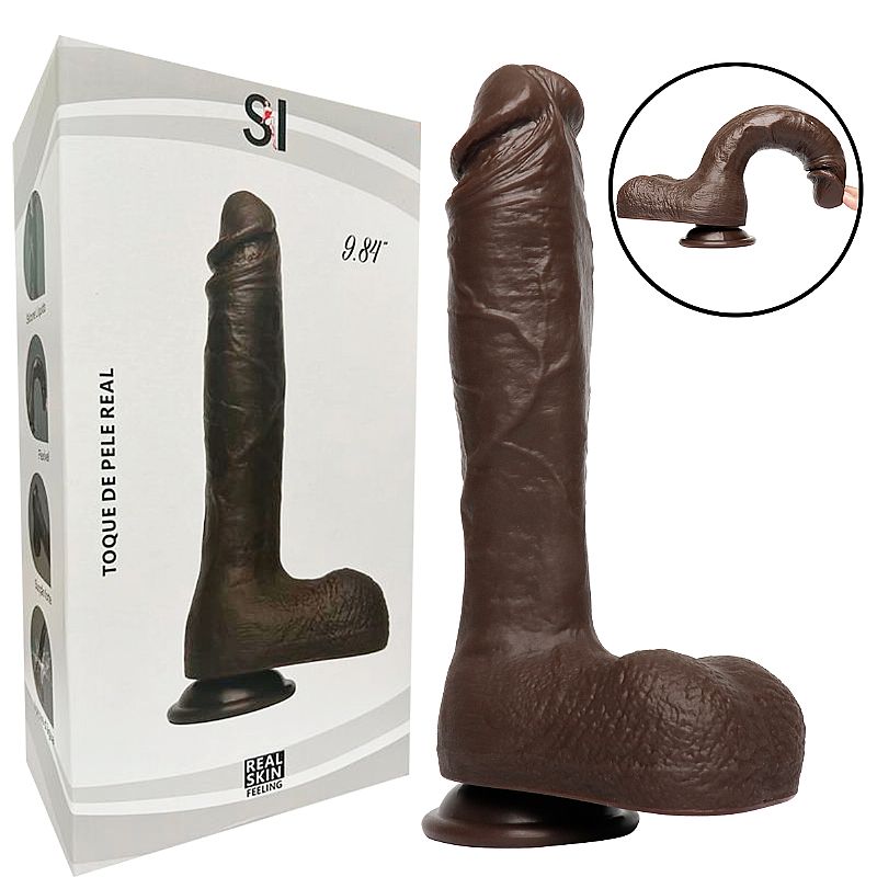 Pênis realístico, confeccionado em silicone. possui glande definida, textura de veias, escroto e ventosa para penetrações em ângulo reto.